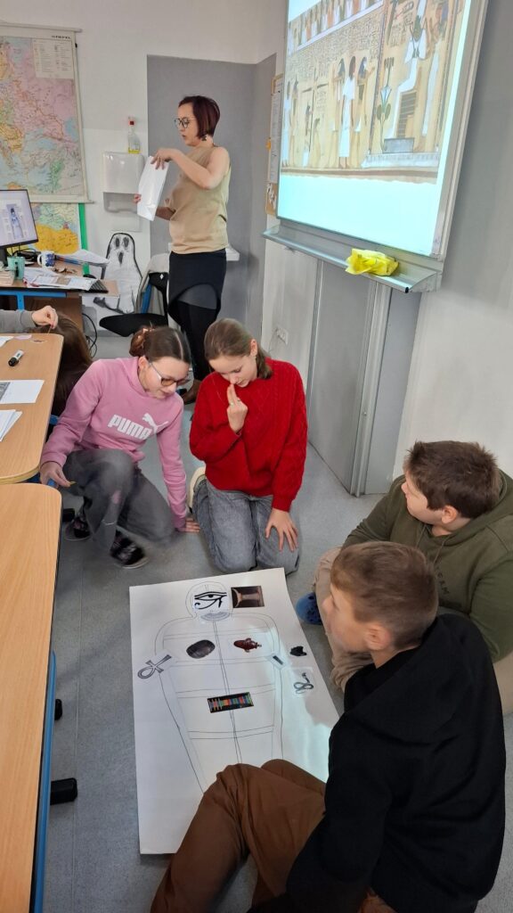 V hodinách dějepisu se třída 6.A ponořila do tajemného světa starověkého Egypta a jeho představy nesmrtelnosti. Nezůstali jsme jen u učebnic – z žáků se na chvíli stali učedníci balzamovačů a pustili se do praktického bádání.