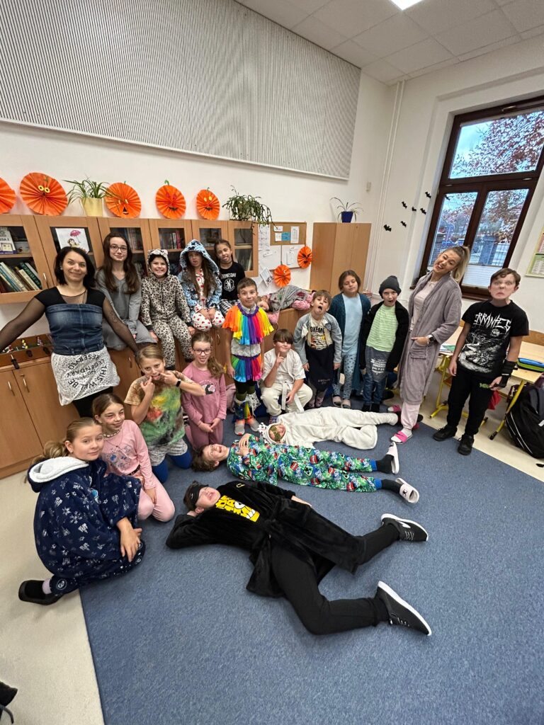 V Nučické škole to vypadalo, jako by někdo převrátil šatník vzhůru nohama! Proběhl Den šílených obleků – a opravdu nikdo nezůstal pozadu. Děti přišly v kombinacích, které by módní návrháři označili za odvážné experimenty – proužky s puntíky, pyžamo s baletní sukénkou, ponožky každá jiná, klobouky, brýle, mašle, samé barvy a smích.