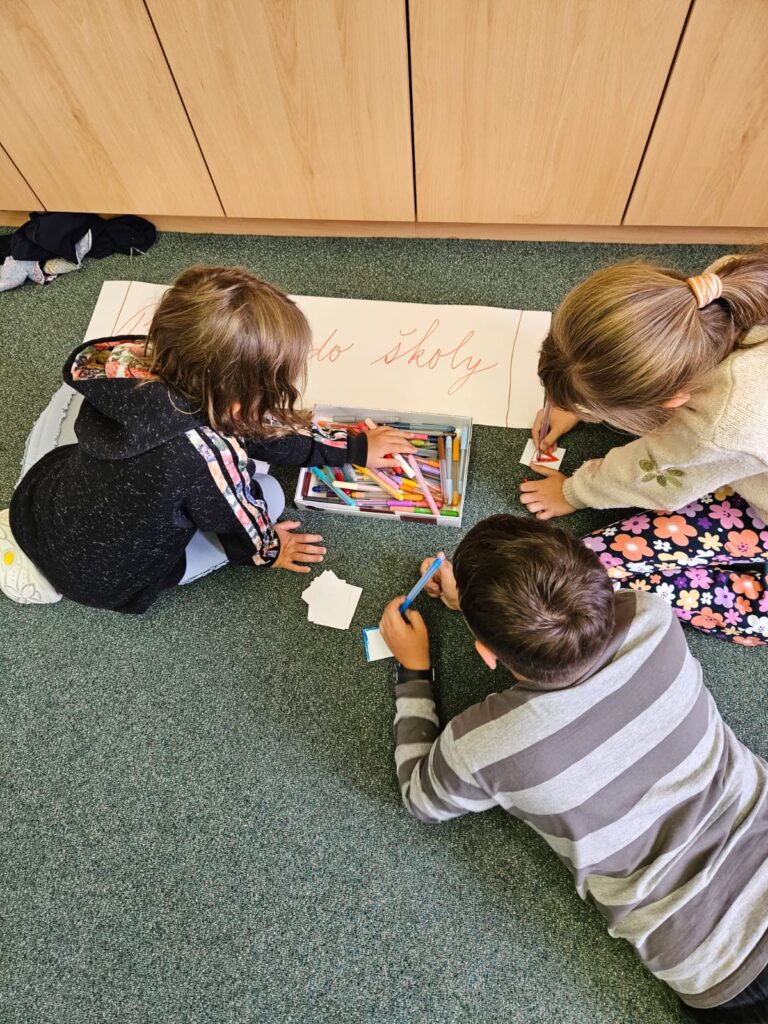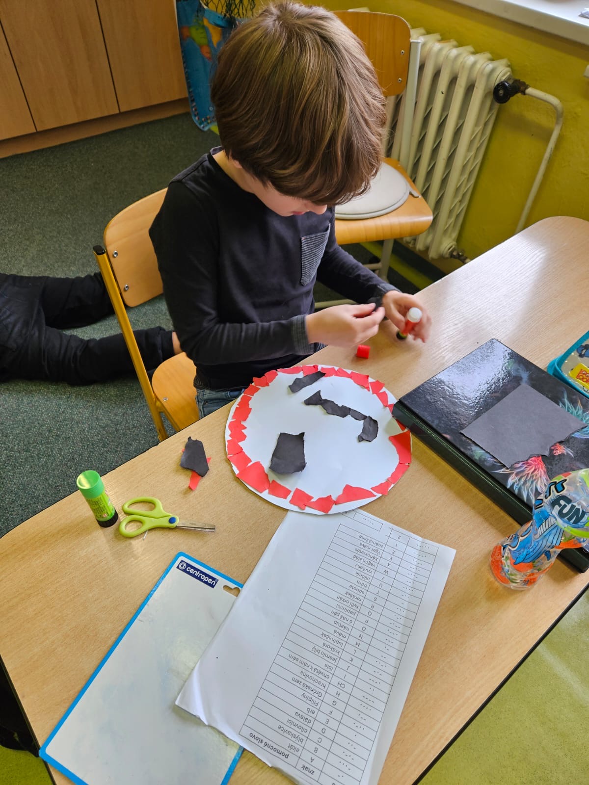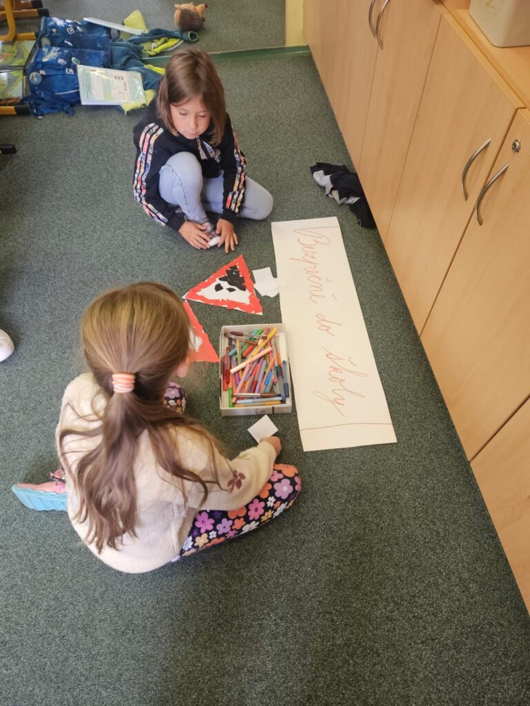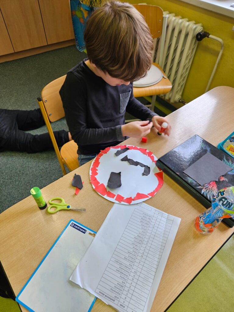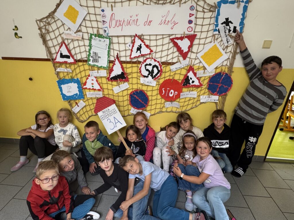 Během hodiny prvouky školáci zaznamenávali pomocí vlastní myšlenkové mapy odpovědi na otázky: Proč? Jak? Kam? se cestuje. Myšlenky se dětem rozletěly mnoha směry, takže jim ani dvojlist papíru nestačil. Poté dokreslovaly dětskému cyklistovi bezpečnostní prvky a samozřejmě si zopakovaly i dopravní značky. Ty se následně staly i námětem velké nástěnky na chodbě malé školy. Třeťáci ji tvořili s myšlenkou, že se na ni podívají i jejich mladší spolužáci, kteří do školy zavítají – a tak se opravdu snažili. V geometrii si připravili základní geometrické tvary a v rámci pracovních činností je technikou trhání dozdobili do podoby dopravních značek.