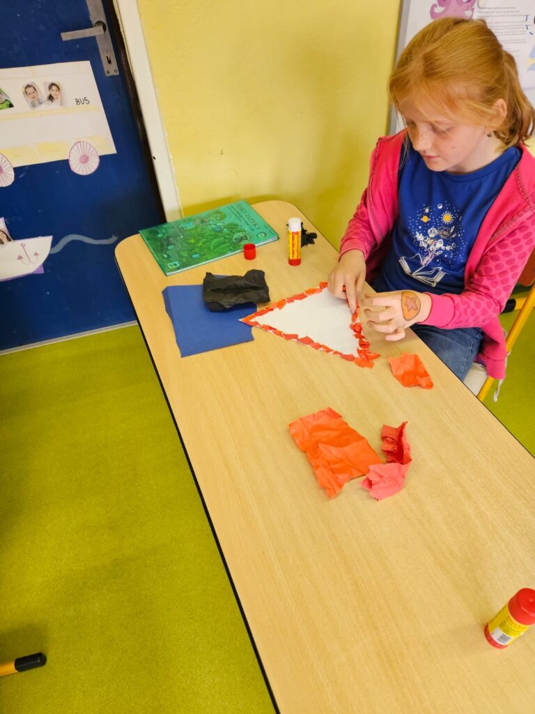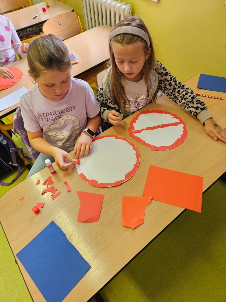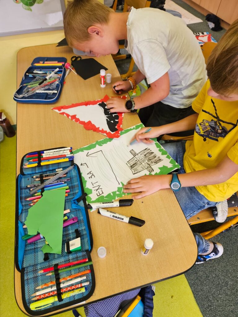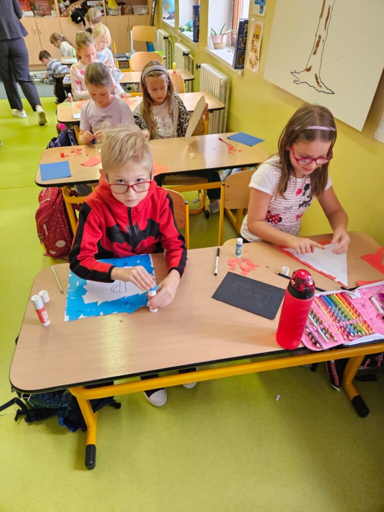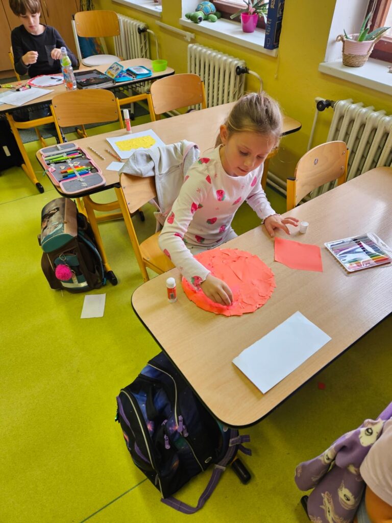 Během hodiny prvouky školáci zaznamenávali pomocí vlastní myšlenkové mapy odpovědi na otázky: Proč? Jak? Kam? se cestuje. Myšlenky se dětem rozletěly mnoha směry, takže jim ani dvojlist papíru nestačil. Poté dokreslovaly dětskému cyklistovi bezpečnostní prvky a samozřejmě si zopakovaly i dopravní značky. Ty se následně staly i námětem velké nástěnky na chodbě malé školy. Třeťáci ji tvořili s myšlenkou, že se na ni podívají i jejich mladší spolužáci, kteří do školy zavítají – a tak se opravdu snažili. V geometrii si připravili základní geometrické tvary a v rámci pracovních činností je technikou trhání dozdobili do podoby dopravních značek.