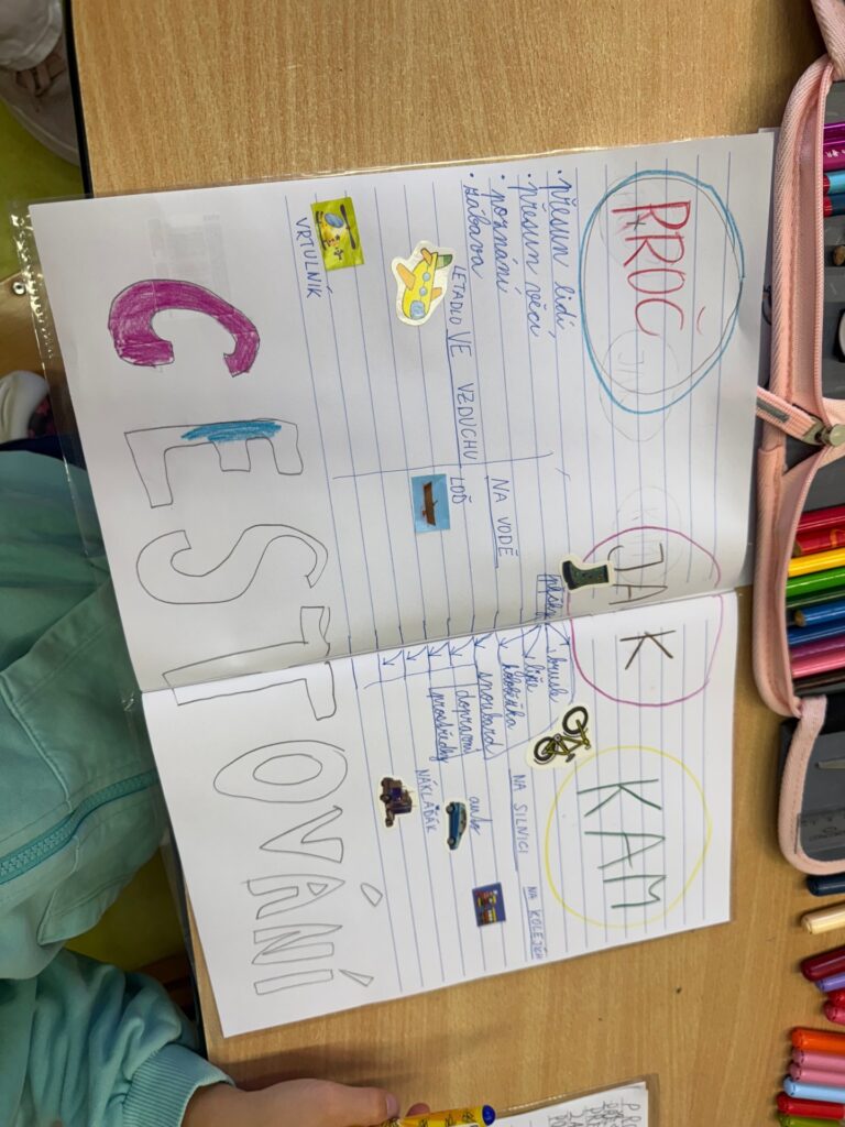 Doprava byla tématem, které děti ze 3.A provázelo celý týden. Každé ráno se samy dostávají do školy v rámci akce Pěšky do školy. Děti chodí opravdu poctivě – buď pěšky, nebo na koloběžce. I ti, kteří bydlí mimo Nučice, soutěží podle pravidel. Jezdí buď MHD, nebo se nechají rodiči vysadit v dostatečné vzdálenosti od školy, aby mohli dojít stejně jako jejich místní spolužáci.