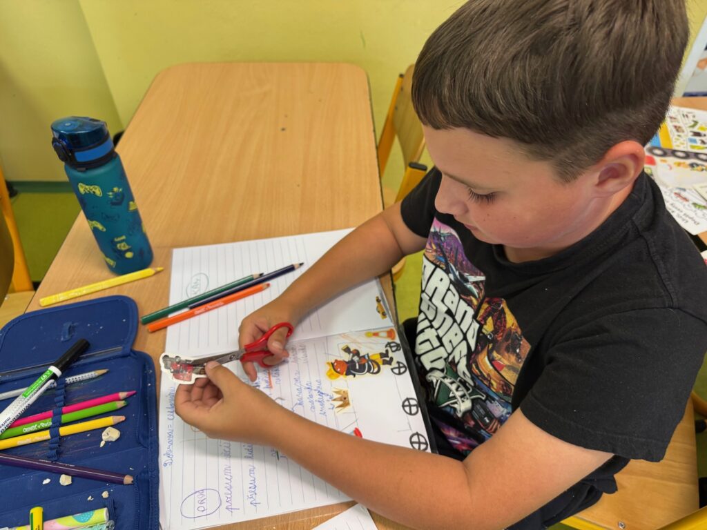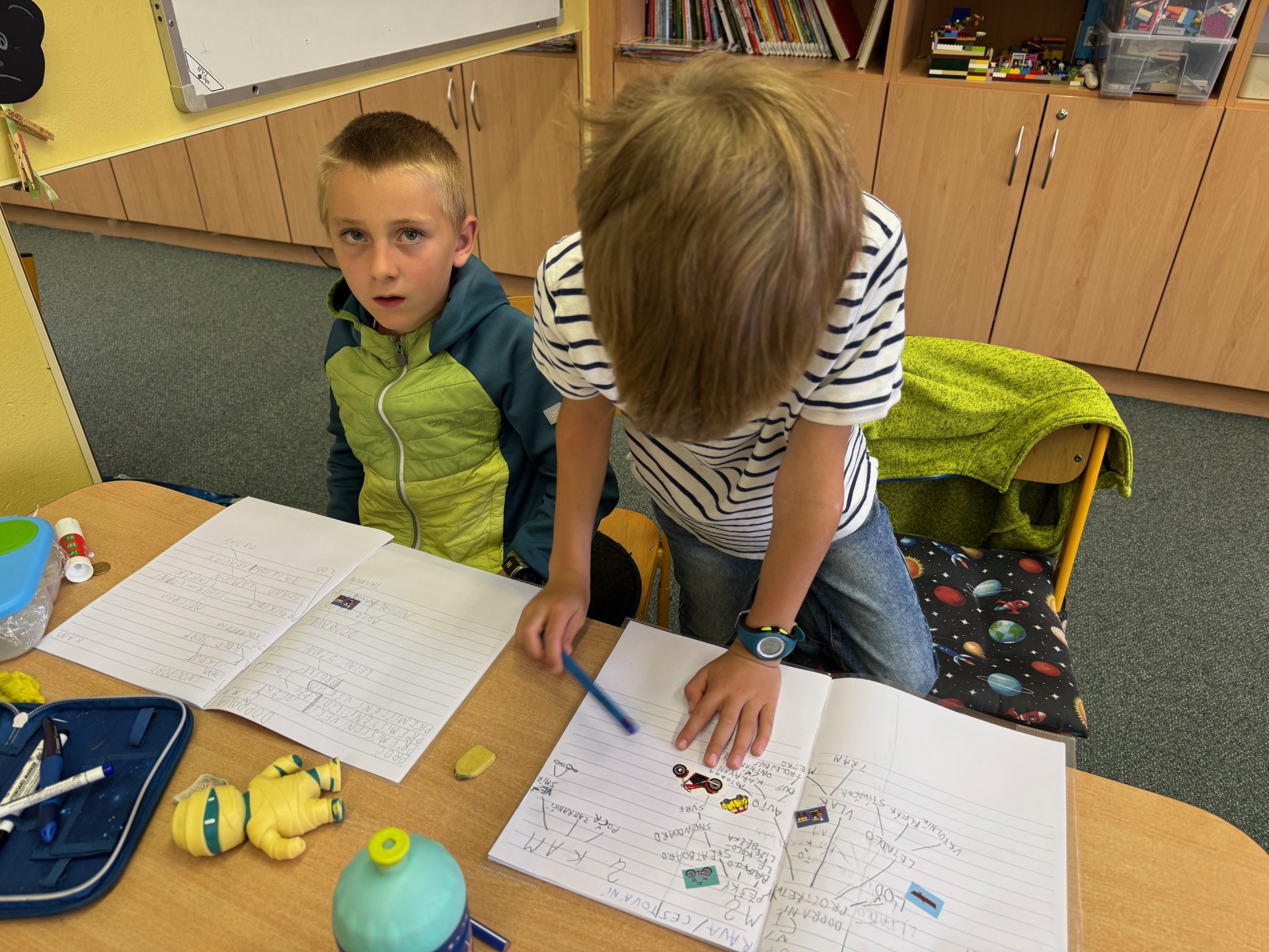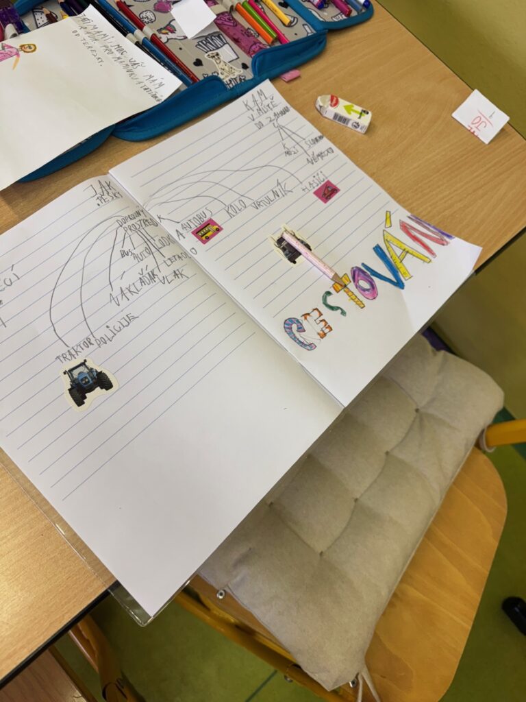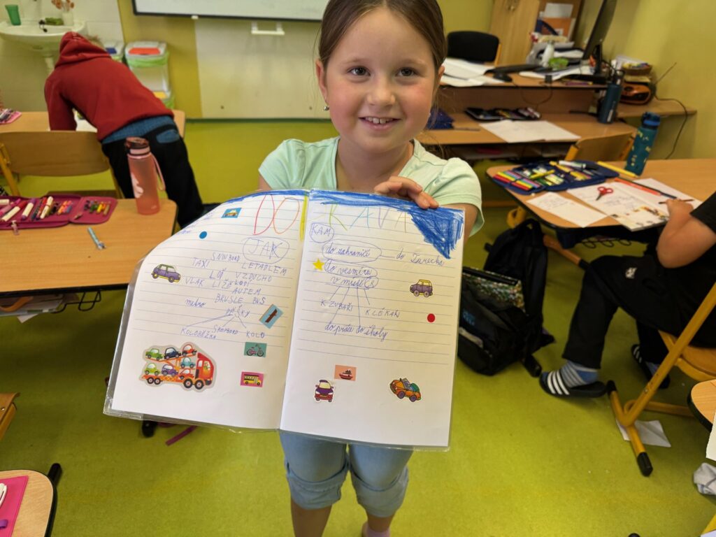 Téma dopravy se mezipředmětově přelilo i do českého jazyka. Metodou párového čtení si děti přečetly text o nepříjemné situaci, která se stala stejně starému školákovi. Otázky k textu i následná debata provedly děti tématikou bezpečnosti na silnici. Dosažené znalosti jim tak jistě vydrží až do doby, kdy se z malých chodců, koloběžkářů a cyklistů stanou velcí řidiči.