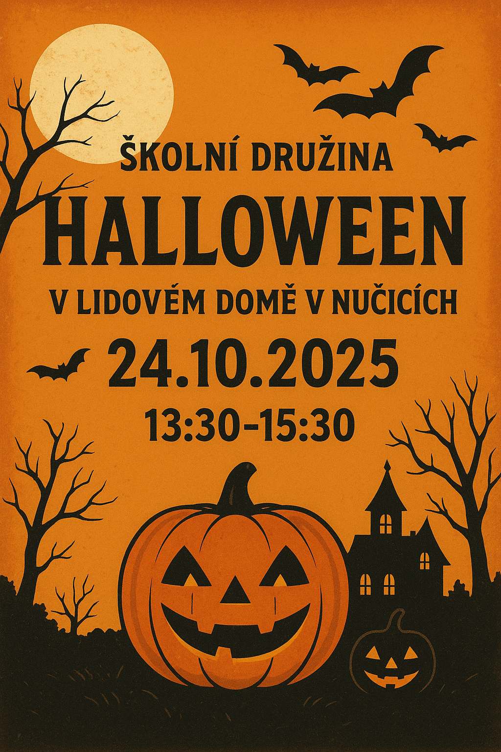 Halloweenský karneval školní družiny 8. 10. 2025 Hrkal Školní družna si Vás dovoluje pozvat na Halloweenskou párty do Lidového domu 24.10.2025 od 13:30-13:50.