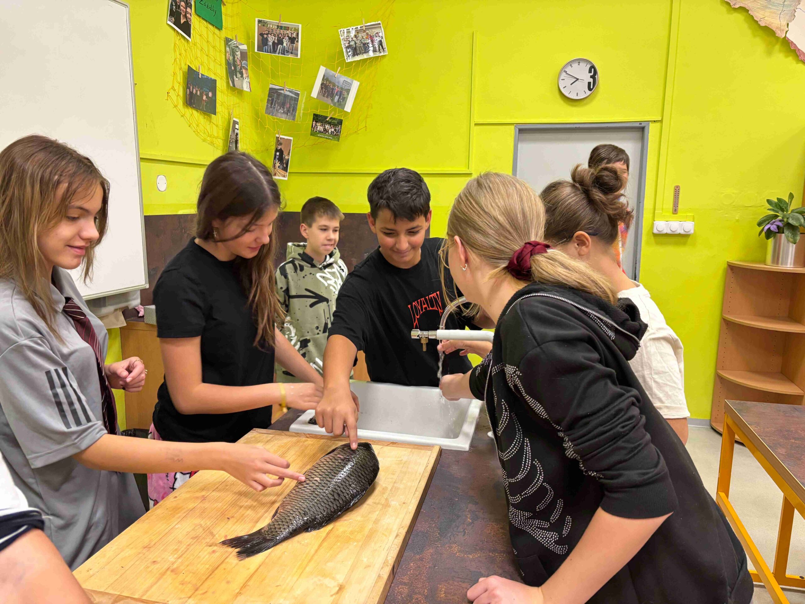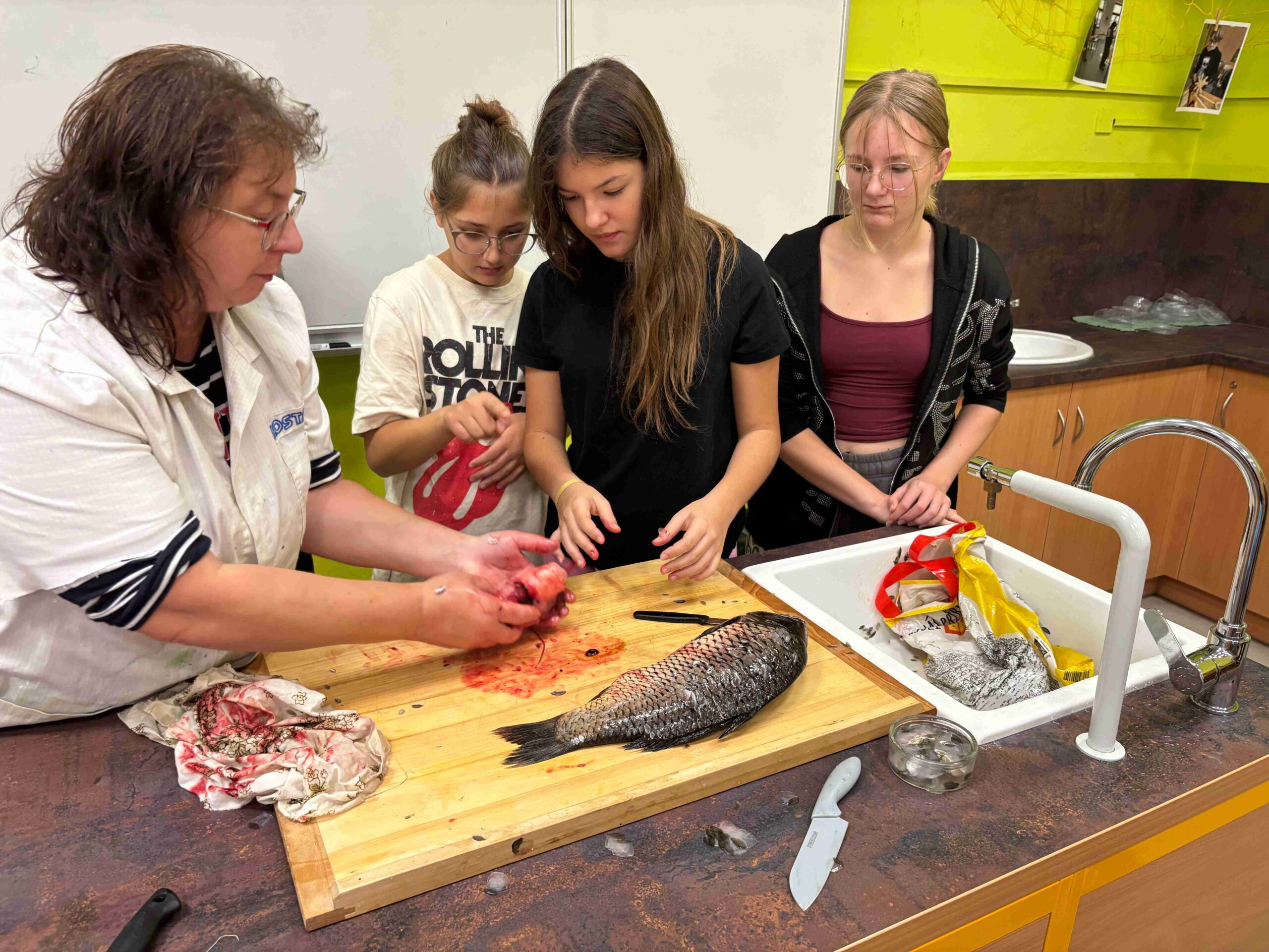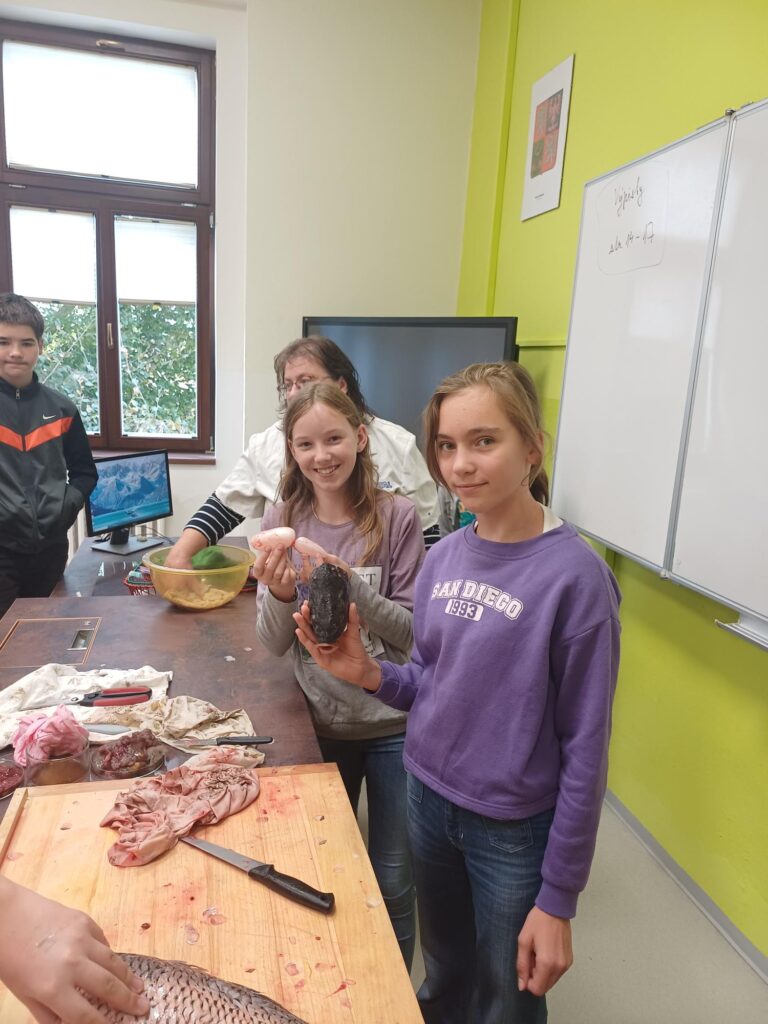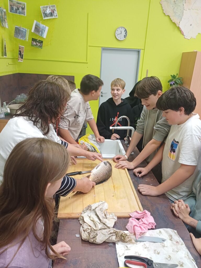 Pod vedením paní učitelky Rysové si žáci vyzkoušeli demonstrační pitvu kapra obecného. Během práce si mohli prohlédnout plynový měchýř, žábry, játra se žlučníkem, srdce, kostru i hlavu. Nechybělo ani určování věku kapra podle přírůstků na šupinách, což děti zvládly na jedničku!