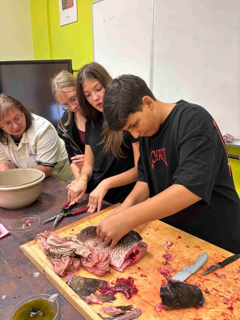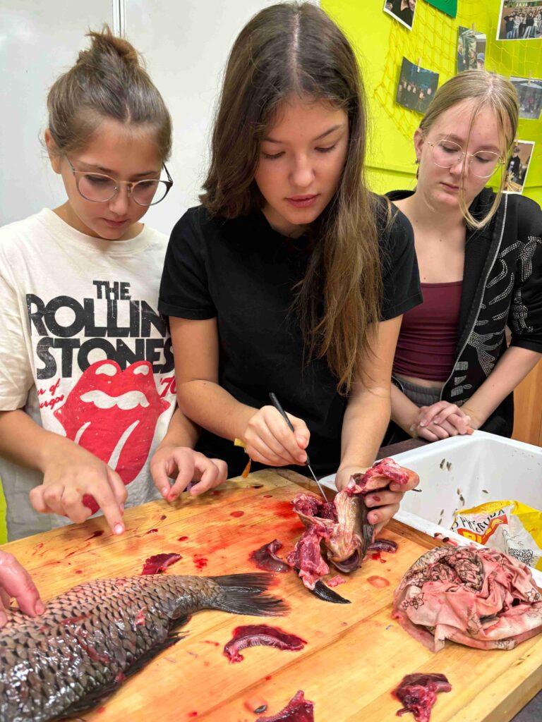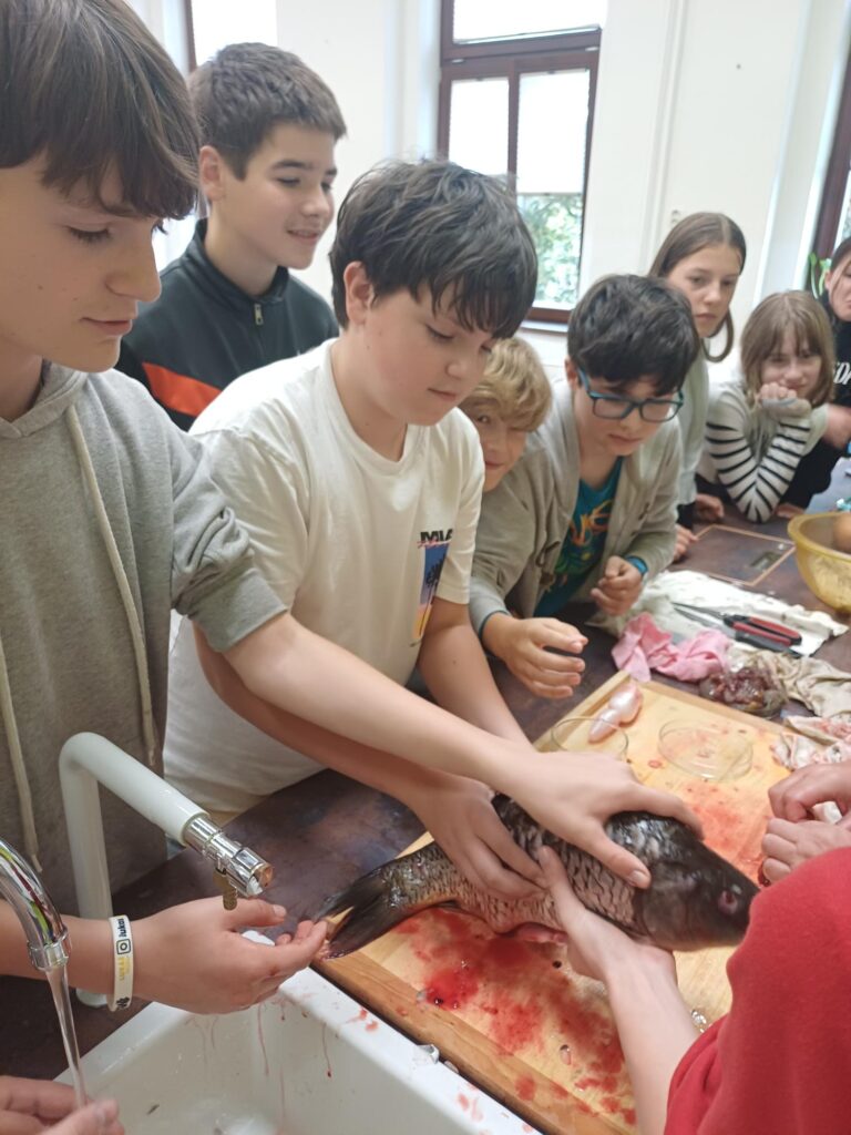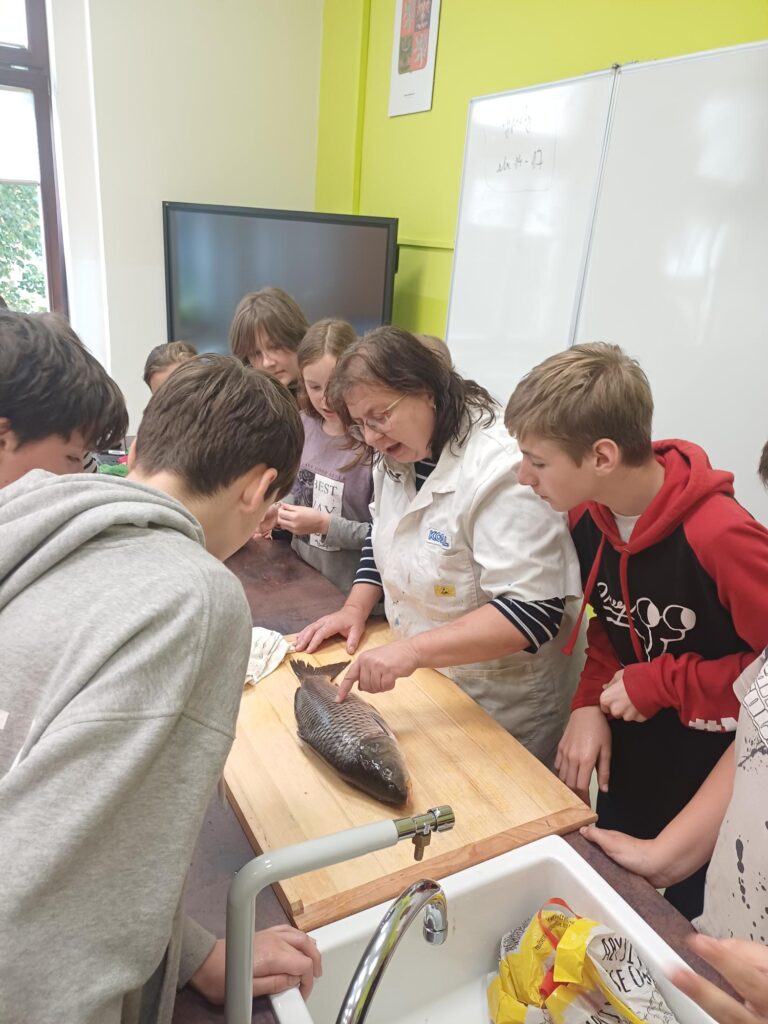 Pod vedením paní učitelky Rysové si žáci vyzkoušeli demonstrační pitvu kapra obecného. Během práce si mohli prohlédnout plynový měchýř, žábry, játra se žlučníkem, srdce, kostru i hlavu. Nechybělo ani určování věku kapra podle přírůstků na šupinách, což děti zvládly na jedničku!