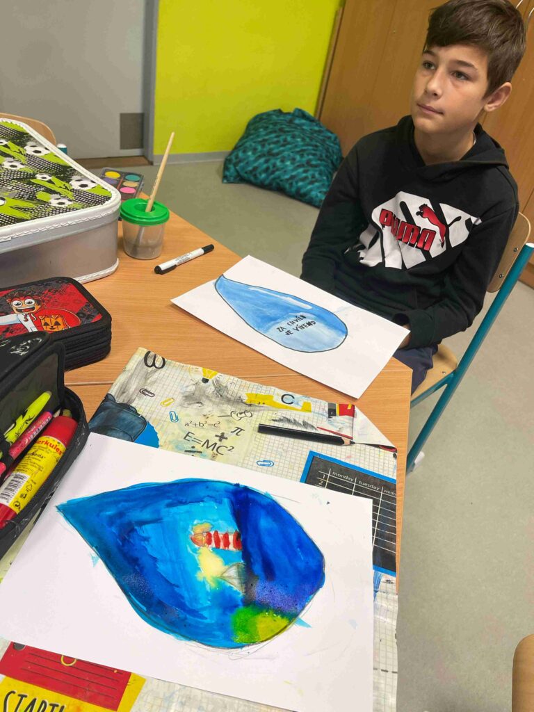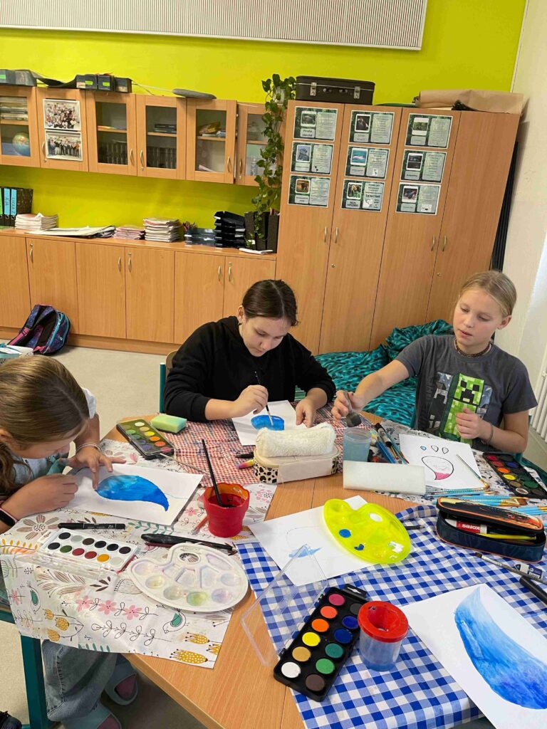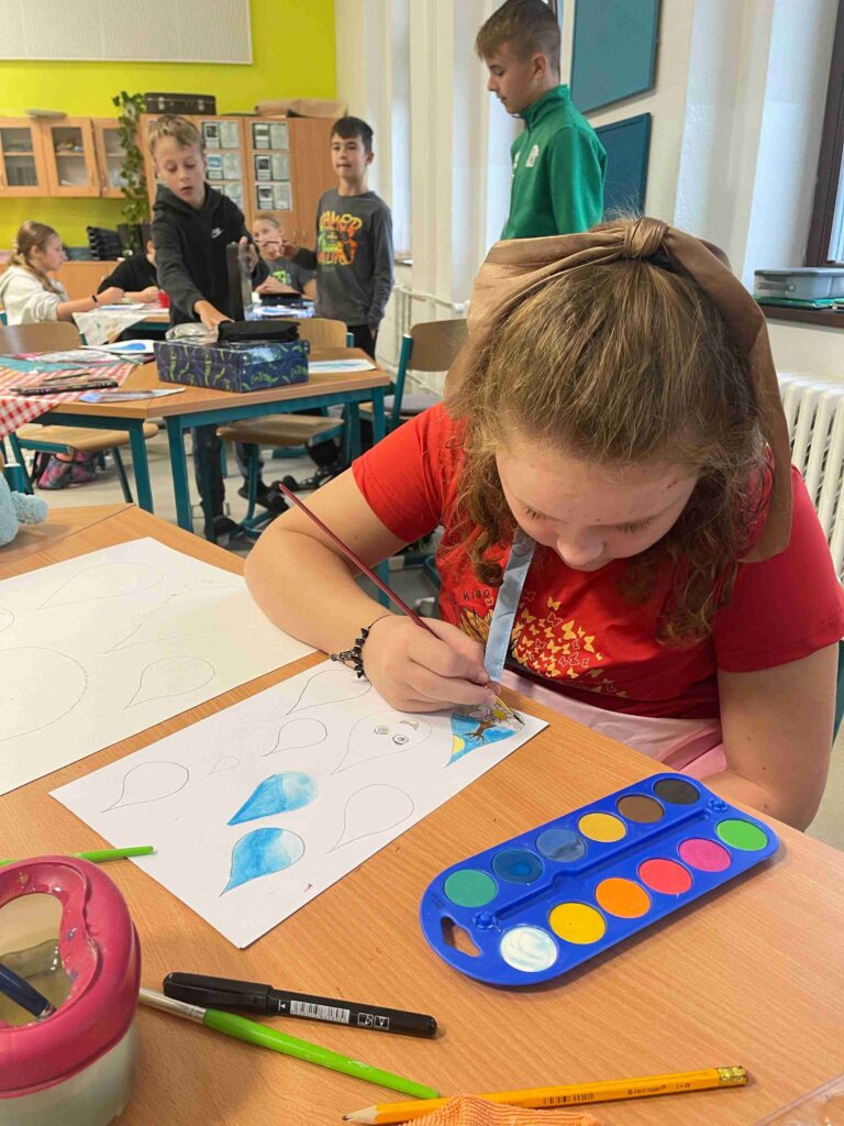 Výsledkem byly desítky jedinečných kapek, z nichž každá nesla kousek osobité fantazie. Někdo do ní ukryl vzkaz, jiný zachytil krásu přírody a další nechal barvy promluvit za sebe. Celá třída se ponořila do práce, a i když venku šedivě pršelo, ve třídě to hýřilo barvami a dobrou náladou.
