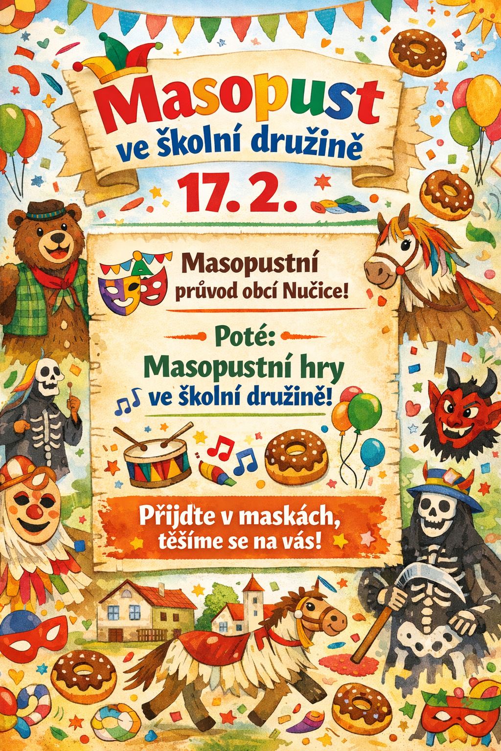 Masopust je pro děti hlavně o radosti, maskách a společném zážitku. Průvodem si připomenou lidové tradice a po návratu do školy bude program pokračovat volnější formou. Připraveny budou jednoduché soutěže, taneční hry a prostor pro setkání napříč odděleními družiny.