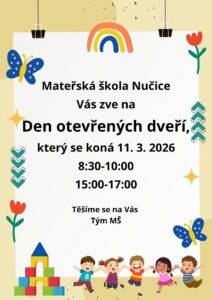 Mateřská škola Nučice zve rodiče i děti na Den otevřených dveří. Přijďte se podívat, jak to u nás vypadá během běžného dne, poznat prostředí tříd, paní učitelky i program, který dětem nabízíme. Dveře budou otevřené ve středu 11. března 2026 ve dvou časech: 8:30–10:00 a 15:00–17:00. Můžete si prohlédnout třídy, zázemí školky, zeptat se na vše, co vás zajímá, a nechat děti nasát atmosféru, ve které trávíme společné dny. Těšíme se na setkání s budoucími školkáčky i jejich rodiči. Přijďte se podívat, pohrát si a poznat naši školku naživo. Celý článek >>