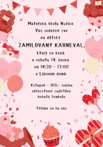 Mateřská škola Nučice srdečně zve všechny děti, rodiče i přátele školy na dětský zamilovaný karneval, který se uskuteční v sobotu 14. února od 14:30 do 17:00 v Lidovém domě. Čeká nás veselé odpoledne plné masek, hudby, tance a dobré nálady. Karneval nabídne prostor pro společnou zábavu dětí i dospělých, radost z převleků a příjemné setkání celé školkové komunity. Připraveno je občerstvení i bohatá tombola, která potěší malé i velké návštěvníky. Vstupné činí 100 Kč za rodinu. Přijďte si s námi užít sváteční atmosféru, pohyb, smích a... Celý článek >>