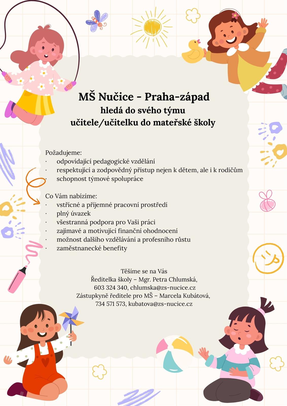 Mateřská škola v Nučicích hledá do svého týmu učitelku nebo učitele.