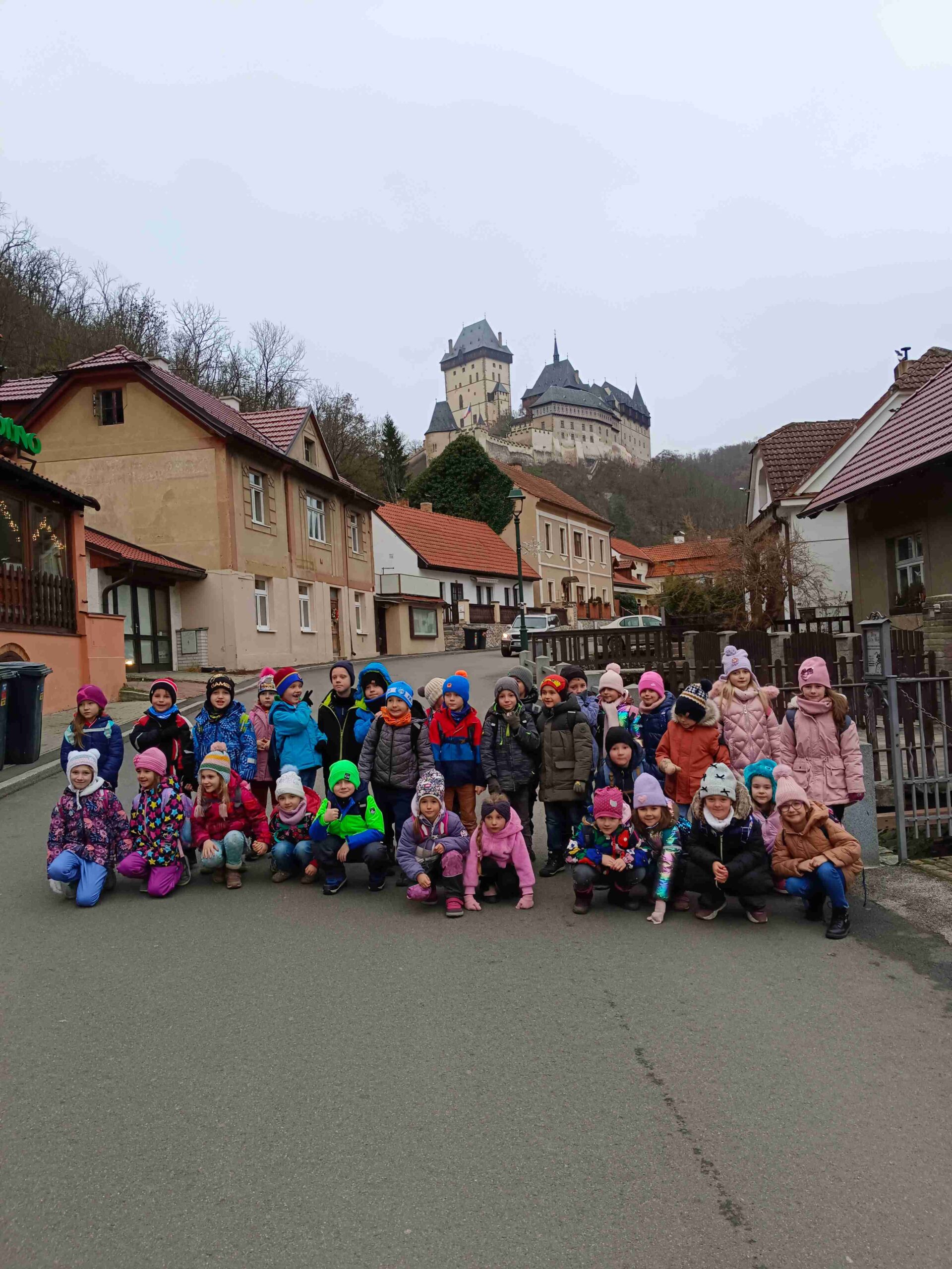 Na závěr nás čekala procházka až ke hradu Karlštejn. I když se prvňáčkům hrad dobýt nepodařilo a brána zůstala zavřená, náladu to nepokazilo. U velkého betlému si všichni společně zazpívali koledu a výlet jsme zakončili s úsměvem, plní zážitků a vánoční pohody.