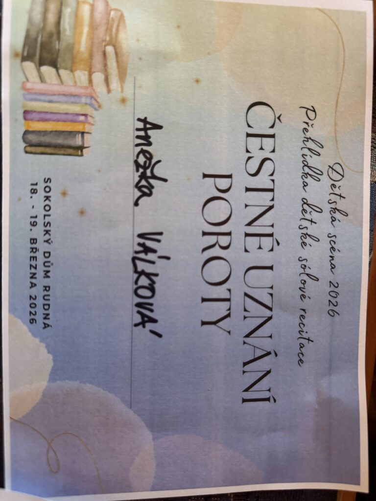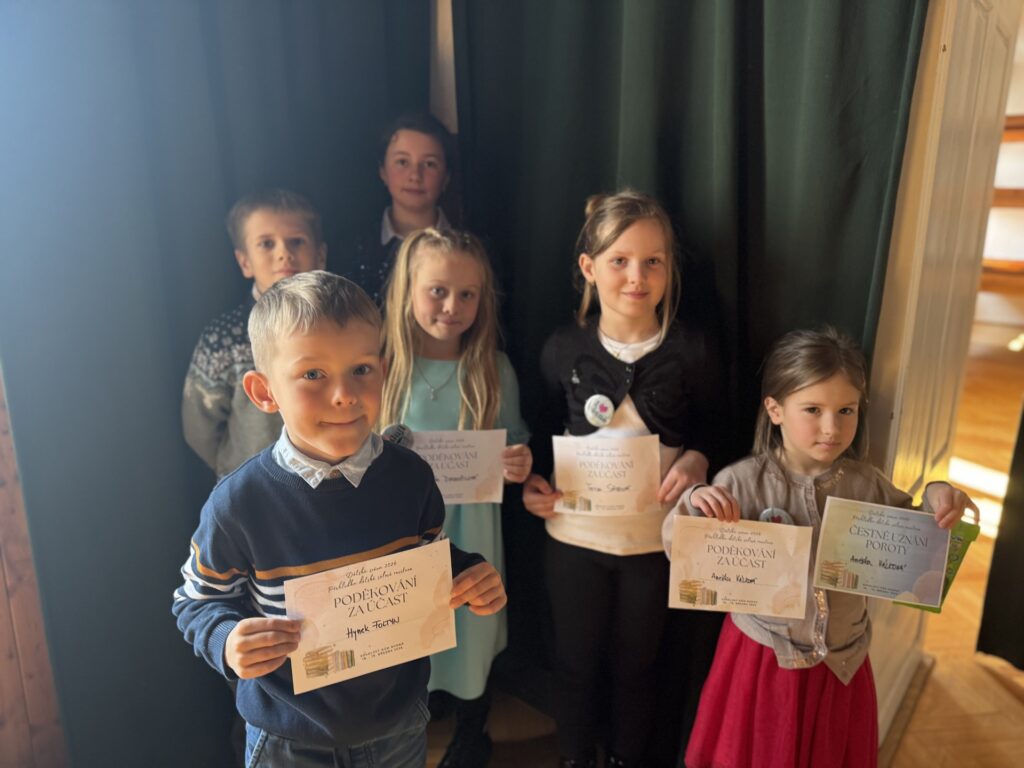Přestože děti zasáhla obrovská tréma, zvládly svá vystoupení se ctí. Nejlepšího ocenění dosáhla Anežka, která získala Čestné uznání poroty. Její kategorie je bohužel nepostupová, ale pokud se zadaří, může v příštím roce ona nebo jiný stejně šikovný recitátor naši školu reprezentovat i v krajském kole.