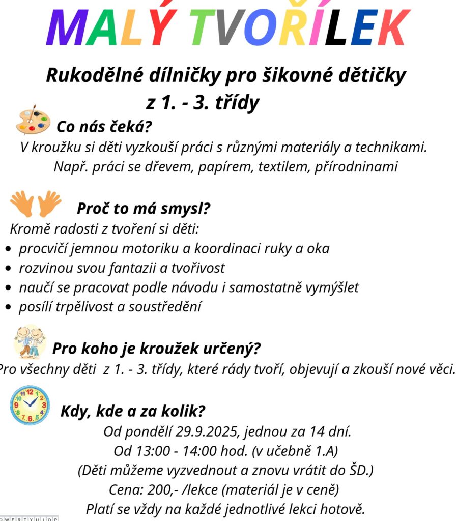 V novém kroužku si děti z 1. až 3. třídy vyzkouší práci se dřevem, papírem, textilem i přírodninami. Tvoření je radost – a navíc procvičí motoriku, trpělivost a představivost. Scházíme se jednou za 14 dní v učebně 1.A, začínáme 29. 9. 2025.