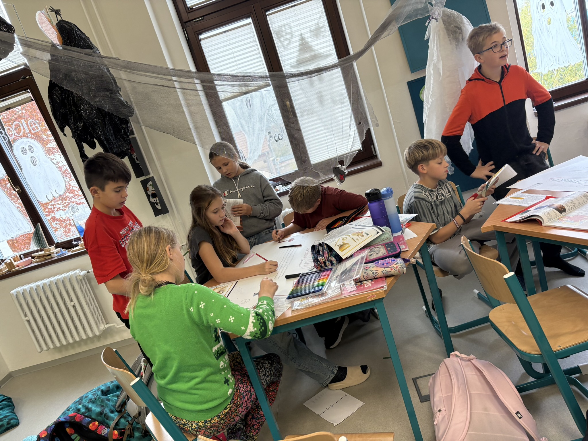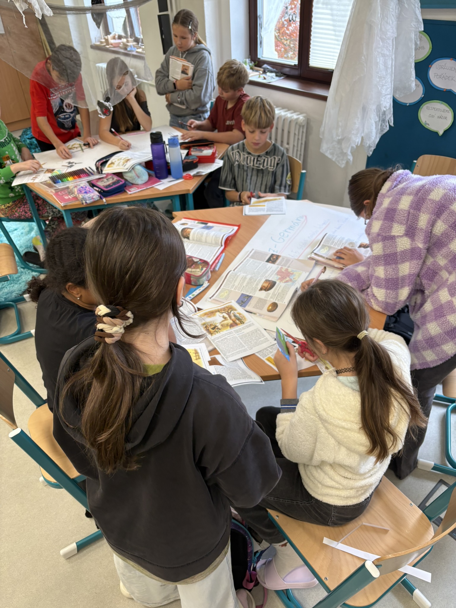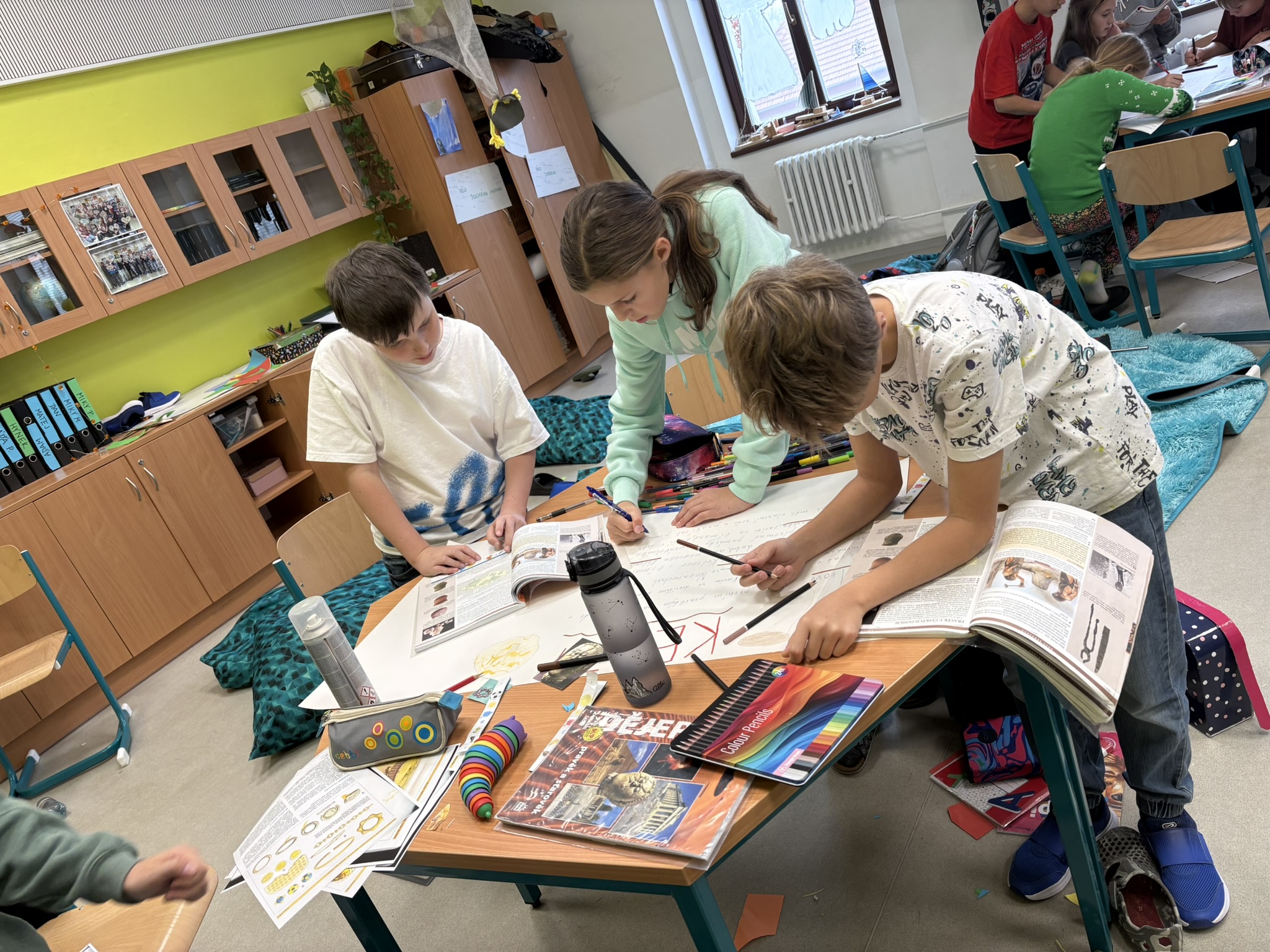 Dovednosti prvních lidí i pravěkého obyvatelstva na našem území jsme shrnuli krásnými výukovými plakáty. Pracovali jsme na nich ve větších skupinách a vysloužili jsme si všichni za svou práci velkou pochvalu.