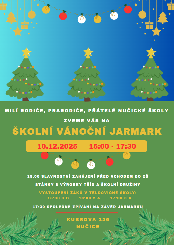 Na závěr nás čeká společné zpívání vánočních koled před školou, které naše setkání zakončí v té nejkrásnější atmosféře. Přijďte si užít chvíle plné pohody, radosti a vánočního kouzla. Jste všichni srdečně zváni – těšíme se na vás!