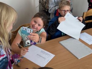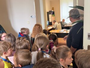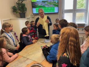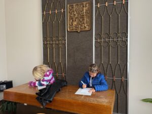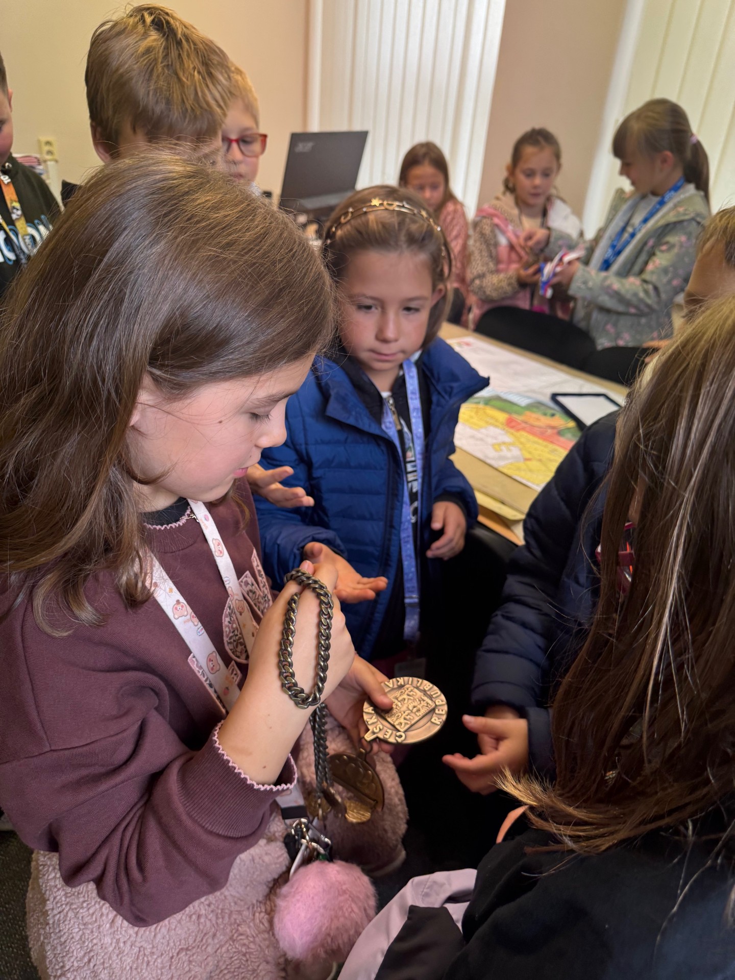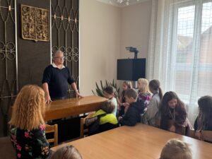 Pan starosta je nejprve přivítal ve své kanceláři, kde jim ukázal trezor s historickými mapami důlní těžby a také úřední insignie, které se používají při oddávání. Děti se nebály ptát a dozvěděly se spoustu zajímavostí o práci starosty. V sekretariátu si prohlédly místní rozhlas a seznámily se s dalšími pracovníky úřadu. A pak už hurá do reprezentativní místnosti, kde se konají svatby, zasedání zastupitelstva — a právě i volby.