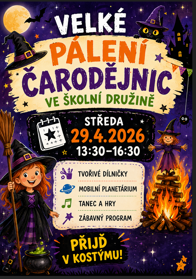 Zveme všechny malé čarodějnice, čaroděje i kouzelníky na zábavné odpoledne plné her, tvoření a kouzelné atmosféry. Ve středu 29. dubna se školní družina promění v místo plné fantazie, kde nebude chybět smích, hudba ani pořádná porce zábavy.