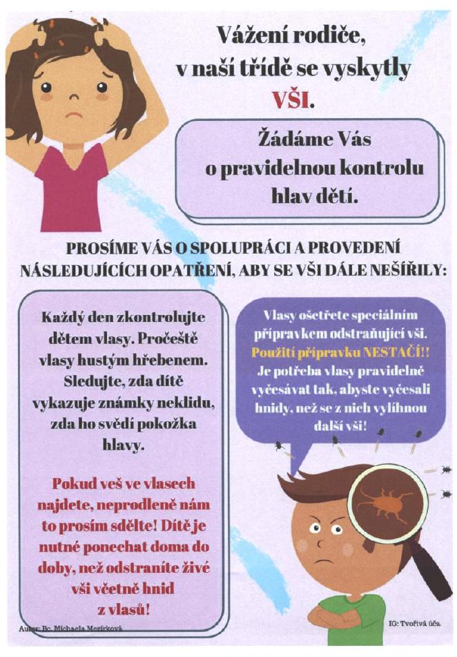 žádáme vás o pravidelnou a pečlivou kontrolu vlasů vašich dětí, ideálně každý den. V případě, že zjistíte výskyt vší, informujte, prosím, neprodleně školu. Veškeré oznámení je anonymní a slouží pouze k tomu, aby měli pedagogové přehled o situaci a mohli případně předejít dalšímu šíření.