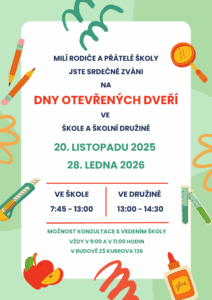 Milí rodiče, budoucí prvňáčci, přátelé školy, rádi bychom vás pozvali k návštěvě naší školy a školní družiny během Dnů otevřených dveří. Termíny: 20. listopadu 2025 28. ledna 2026 Budete mít možnost nahlédnout do výuky, projít si třídy, učebny i školní družinu. Uvidíte, jak vypadá běžné dopoledne, jak děti pracují, spolupracují a jaké pomůcky při výuce používáme. Ve školní družině můžete nakouknout do volnočasových aktivit a prostředí, kde děti tráví odpoledne. Časy návštěv: Ve škole: 7:45 – 13:00 Ve družině: 13:00 –... Celý článek >>